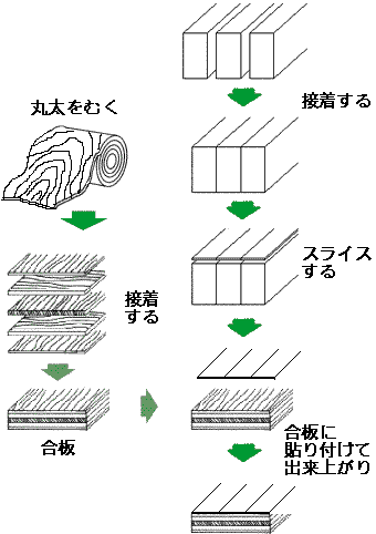 複合フローリングは合板に突き板(木をスライスした0.3~1.5ミリの薄板)または挽き板(のこぎりで薄く挽いた3~5ミリの薄板)を貼ったもの。 単層フローリングは無垢材のフローリングです。 現在圧倒的に複合フローリングが普及していますが、出来れば無垢フローリングにしたいものです。 強度、耐久性、調湿機能などの性能面で無垢フローリングの方が遙かに優れているからです。 下の複合フローリングの作り方を読んでください。 複合フローリングが何故無垢に劣るのか、よく分かると思います。